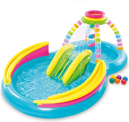 Dit speelcentrum met een regenboogontwerp zorgt voor plezier en verfrissing op warme zomerdagen. Het biedt een glijbaan, sproeier en een set van 6 ballen voor de beste ervaringen.