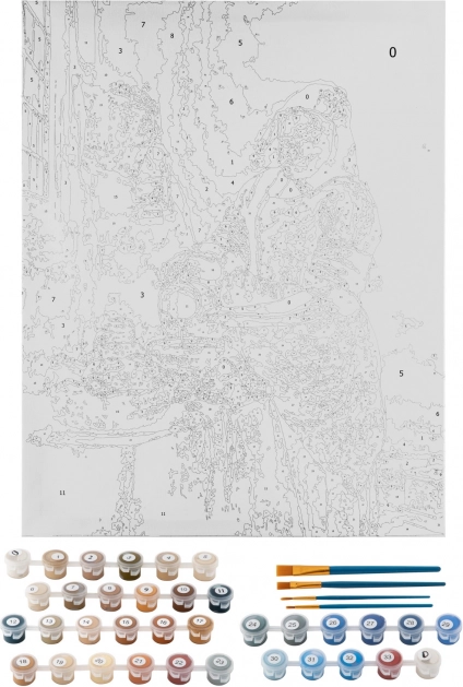Alles wat je nodig hebt in één pakket: voorbedrukt canvas, 35 kleuren en 4 penselen – open en begin met schilderen zonder extra aankopen.