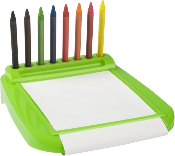 De tekentafel maakt een praktische ordening van waskrijtjes en papier mogelijk, wat het creëren voor kinderen vergemakkelijkt.