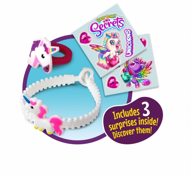 - 1× pluche eenhoorn Baby Gemmy, 1× armband met verrassing, 1× ring met verrassing, 1× stickers