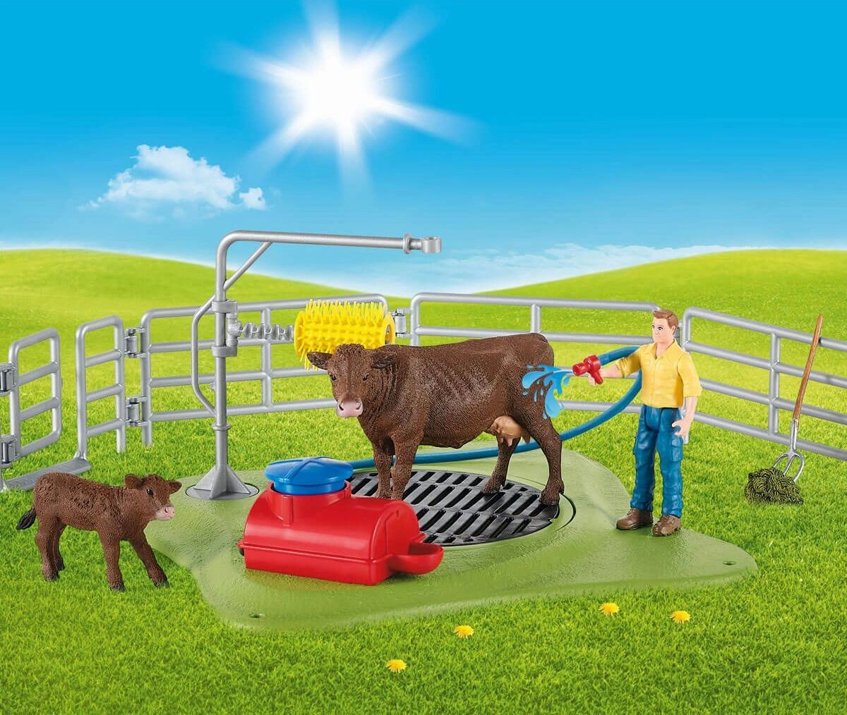 De washoek voor vee uit de SCHLEICH Farm World-serie verandert de dagelijkse dierenverzorging in een fantastische ervaring. Boer Martin spuit echt water met de werkende pomp, terwijl het kalf op de draaibare schijf staat zodat het van alle kanten kan worden gewassen. Na de douche volgt een borstelmassage die de koeien mooi schoon maakt en jonge veehouders blij maakt.