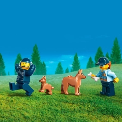 Twee politie-minifiguren, een hond en een puppy, plus een borstel, zaklamp, schep en traktaties – alles voor levendige scènes met hondengeleiders.