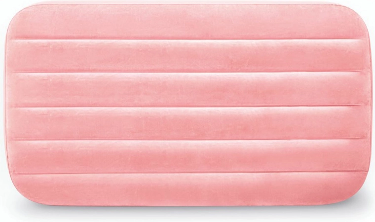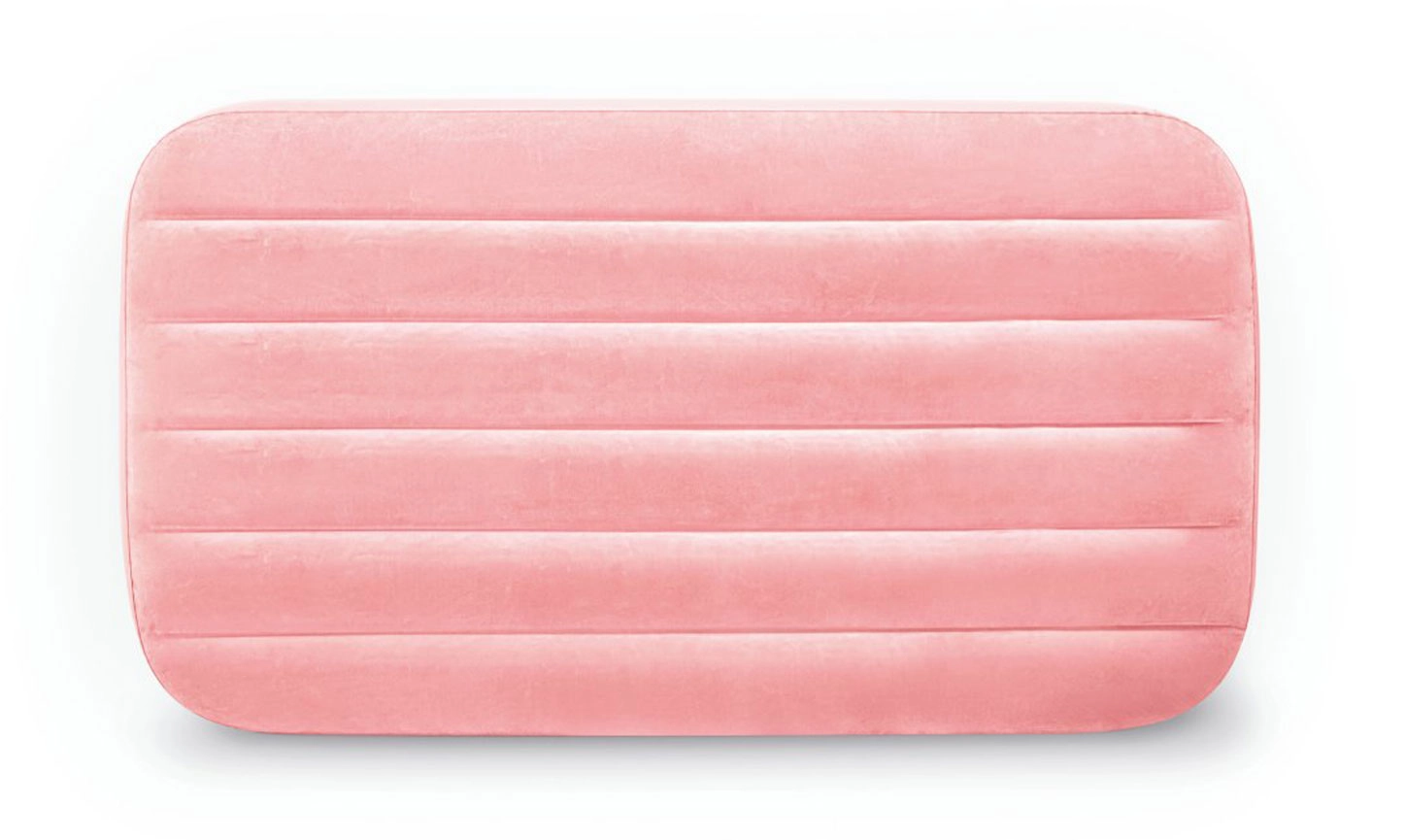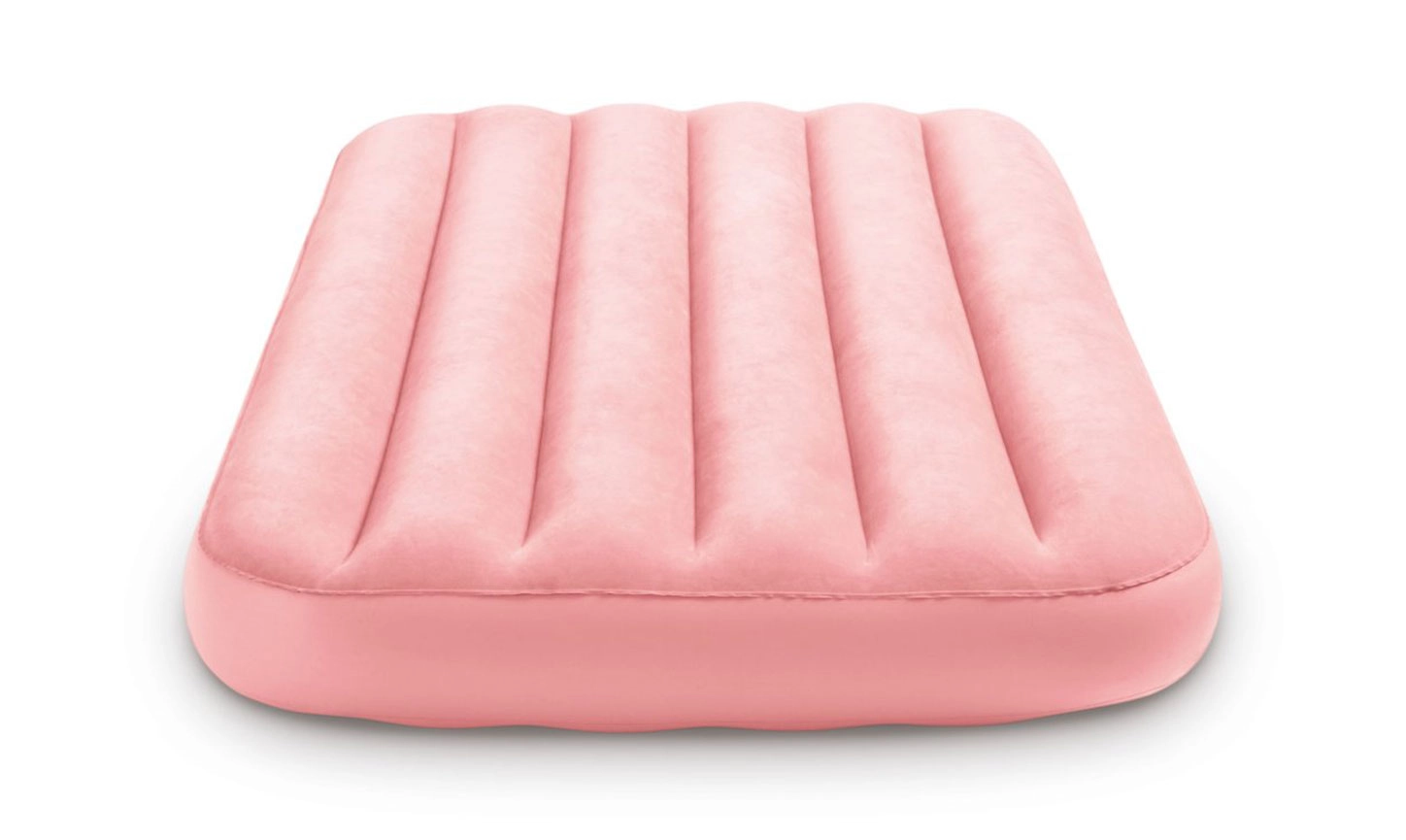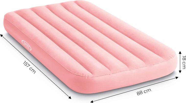 Licht en comfortabel opblaasbaar kinder luchtbed van INTEX met afmetingen 157 × 88 × 18 cm, ideaal voor thuis en op reis. Biedt een zachte suède (velours) toplaag, een stevige FIBER-TECH / DURA-BEAM constructie en een maximale belastbaarheid van 45 kg. Eenvoudig op te blazen en op te bergen; de roze uitvoering zal kleine slapers aanspreken.