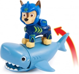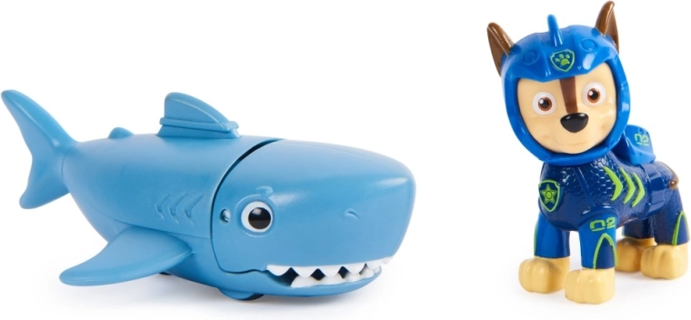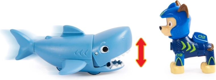 De Chase-figuur draagt een nieuw neopreen pak, zodat hij klaar is voor elke reddingsactie onder water. Kinderen kunnen Chase op de rug van zijn haaienvriend bevestigen en het bijtmechanisme activeren met een eenvoudige voorwaartse beweging. Authentieke details en een ontwerp geïnspireerd op de serie "PAW Patrol" zorgen voor uren speelplezier en het ontdekken van creatieve reddingsmissies.