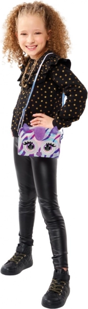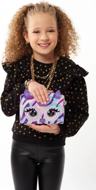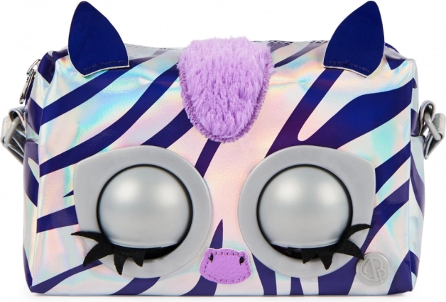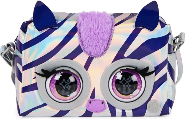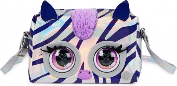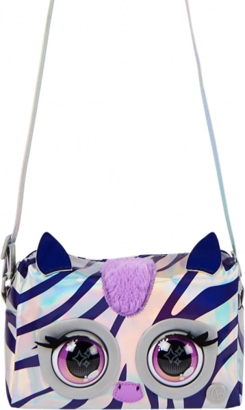 De metalen tas uit de Purse Pets-serie zal kinderen verblijden met zijn unieke stijlvolle ontwerp en interactieve functies. De tas is gemaakt van glanzend zilveren stof met holografische paarse strepen die een modieuze uitstraling bieden. Dankzij de aanraakgevoelige sensor reageert de tas met knipperende ogen en produceert hij tot 30 verschillende geluiden, waardoor hij een leuke metgezel voor elke dag is.
