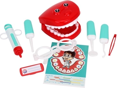 Deze kleurrijke tandartsset is ideaal voor kleine, nieuwsgierige dokters. Je vindt erin alles wat nodig is voor een leuk onderzoek van speelgoed: een kaakmodel, spiegeltje, sonde, boor, spuit, pincet, bril en badge. Ook inbegrepen is een overzichtelijk schema van tandenummering, waardoor kinderen gemakkelijk de basis van tandverzorging leren.