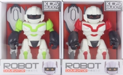Kunststof robot op batterijen met schild en pistool. De robot loopt, draait, maakt geluiden en licht op. Werkt op 3 AA-batterijen (niet inbegrepen). Afmetingen van de robot ca. 16 x 21 cm. Afmetingen van de verpakking ca. 19,5 x 24 x 9,5 cm. Leeftijd 3+.