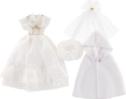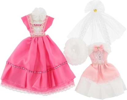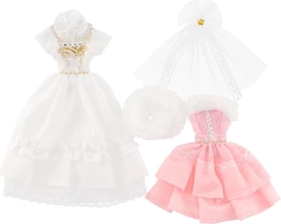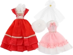 Twee verschillende sets jurken, elk met eigen details, die elke pop een uitzonderlijke uitstraling geven.