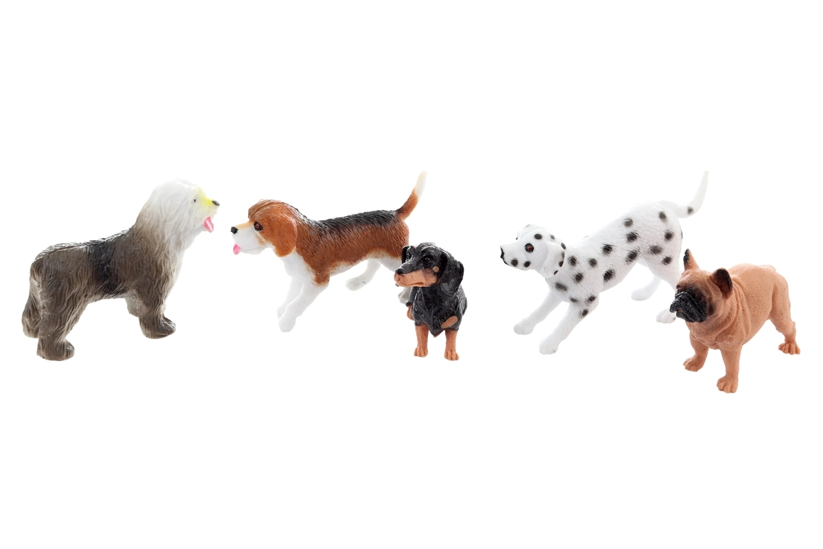 Elk hondje is ongeveer 7 cm lang (afhankelijk van het ras) en gemaakt van stevig plastic dat dagelijkse speelsessies aankan. De verpakking van circa 15 × 18 × 4 cm bevat vijf verschillende figuurtjes, zodat kinderen hun dierencollectie kunnen uitbreiden en de rassen leren herkennen.