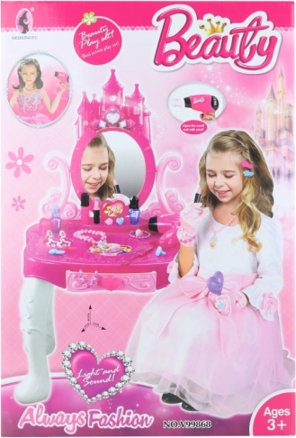 Met een eenvoudige druk op de knop gaat de tafel licht geven en speelt er een melodie, wat het spel extra realistisch maakt. Bij de tafel hoort ook een comfortabele kunststof kruk. Alles wat je kind nodig heeft voor beautyspel is aanwezig!