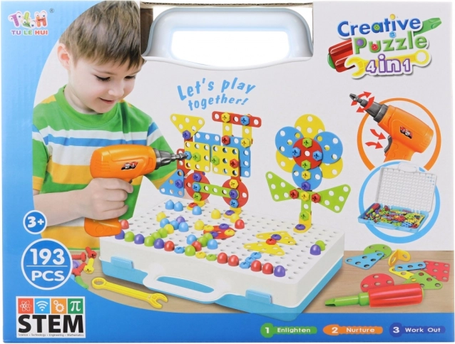 Schroefconstructieset met boormachine, 193 onderdelen, koffer en handleiding. Stimuleert creativiteit en motoriek voor kinderen vanaf 3 jaar. Boor op 2× AA-batterijen. Perfect als cadeau.