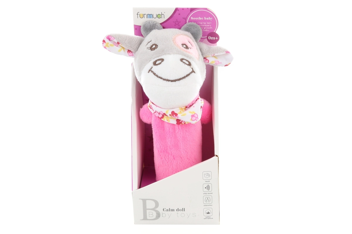 Een schattige pluchen rammelaar in de vorm van een roze koetje zal elke baby blij maken. Biedt een zacht piepgeluid, een aangenaam pluchen materiaal en een comfortabele grip voor kleine handjes. Ideaal voor zintuigstimulatie, motorische ontwikkeling en plezier thuis en onderweg.