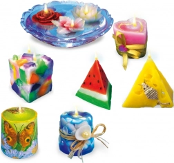 Met deze grote set kun je tot 9 kaarsen thuis maken. Verschillende kleuren en vormen kaarsen (hart, watermeloen, zee-thema, drijfkaarsen, kaas en muis, mozaïek, enz.). De set bevat alles wat je nodig hebt (paraffine, gietmallen, kleurstof, lonten, acrylverf, lijm, glitter, glaskralen, satijnen linten, enz.). De set bevat bijvoorbeeld een wasbasis, sjablonen, bekers, vormpjes, draad, kralen, schelpjes, een decoratieve servet, verven, lint, lijm, touw, waskrijtjes en nog veel meer. Afmeting van de verpakking: 30 x 44 x 6 cm. Leeftijd 7+. GEPRODUCEERD IN EUROPA
