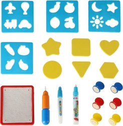 In de verpakking zitten stempels, sjablonen, waterstiften en een penseel. Kinderen leren vormen en kleuren en verbeteren hun fijne motoriek.