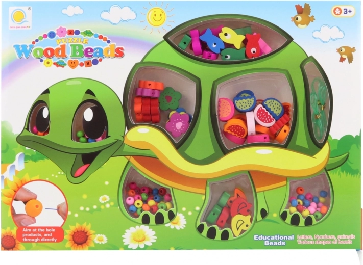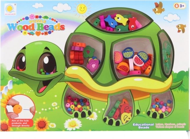 Creatieve set houten kralen met schildpadmotief voor kinderen vanaf 3 jaar, stimuleert de fijne motoriek en verbeelding. Bevat veel kleurrijke vormen en rijgveters in een praktische verpakking van ca. 28 × 19,5 × 2,5 cm.