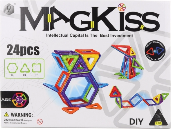 Probeer de magnetische bouwset MagKiss, die niet alleen plezier biedt, maar ook de ontwikkeling en creativiteit van uw kinderen stimuleert. Deze set bevat 24 onderdelen in de vorm van driehoeken, vierkanten en zeshoeken. Dankzij de eenvoud en veelzijdigheid is de bouwset geschikt voor het samenstellen van allerlei fantasierijke vormen.