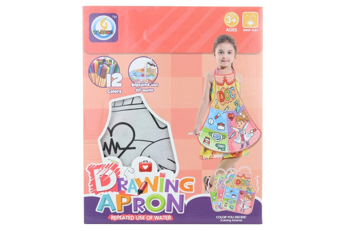 Ontdek knutselen zonder rommel – het kleur-schort voor kinderen van ca. 36 × 46 cm heeft een afwasbaar oppervlak, dus even onder de kraan en je kunt opnieuw en opnieuw kleuren. In de verpakking zitten 12 gekleurde stiften, ideaal voor kinderen vanaf 3 jaar.