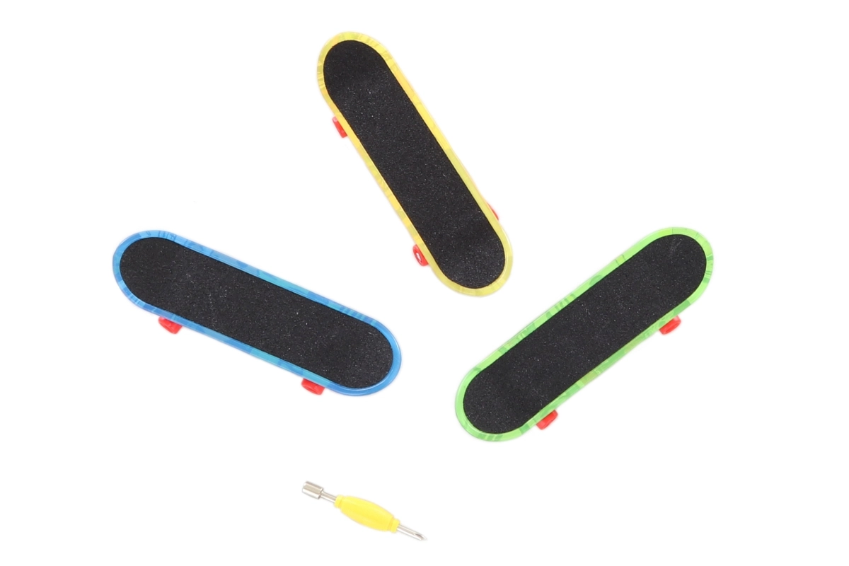 In de verpakking vind je 3 mini-skateboards en een schroefgereedschap. AG13-batterijen zijn inbegrepen, dus je kunt meteen beginnen.