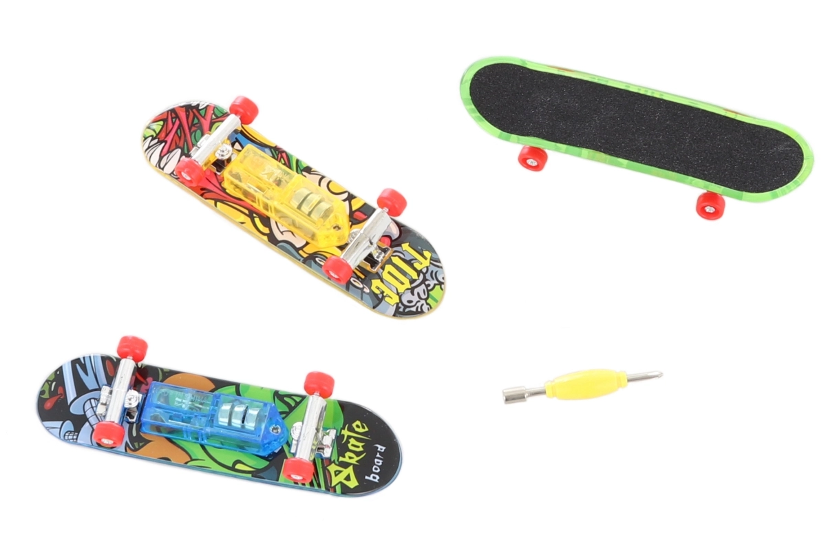 Leuke set van drie vinger-skateboards met ingebouwde verlichting voor coole tricks op tafel en thuis. Elk mini-skateboard heeft compacte afmetingen, werkt op batterijen en in de verpakking zitten ook handige accessoires. Ideaal cadeau voor kinderen vanaf 9 jaar en alle fans van fingerboarding. Geniet van lichteffecten, eenvoudig schroeven en geweldige wendbaarheid in een zakformaat.