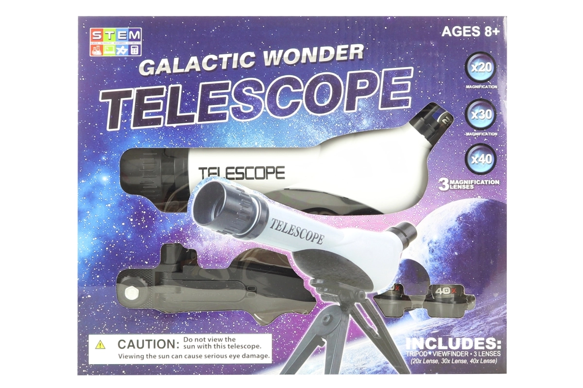 Ontdek de nachtelijke hemel met deze kunststof kindertelescoop met statief, met een objectiefdiameter van 60 mm, vergrotingen 20×, 30× en 40× en eenvoudige scherpstelling op 170 mm. Ideaal voor beginnende astronomen vanaf 8 jaar.