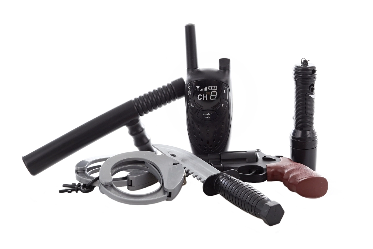 De kinderpolitieset met een stevige leren riem en uitgebreide uitrusting zal alle kleine handhavers van de wet blij maken. De verpakking bevat alles voor een actievol spel: pistool, mes, portofoon, handboeien, zaklamp op batterijen en wapenstok. Inclusief 3 AG13-batterijen, zodat het plezier meteen kan beginnen. Geschikt voor kinderen vanaf 6 jaar.