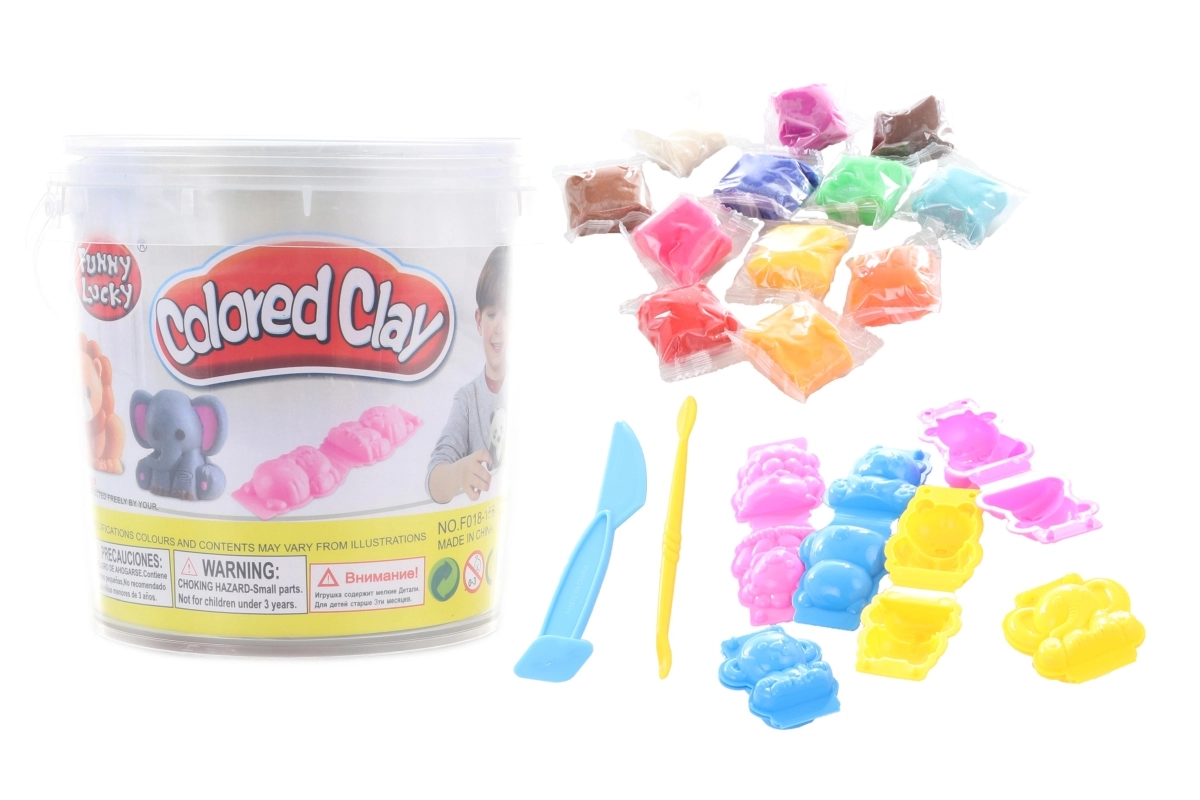 De schilderset bevat 12 pakjes klei in verschillende kleuren, 6 vormpjes en een kunststof mesje. Alles is opgeborgen in een praktische kunststof emmer. Afmetingen van de verpakking ca. 13 x 13 x 12,5 cm. Leeftijd 3+