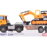 Kunststof vrachtwagen met graafmachine, ca. 28 x 10,5 x 8 cm. Afmeting verpakking ca. 32 x 13 x 9 cm. Leeftijd 3+