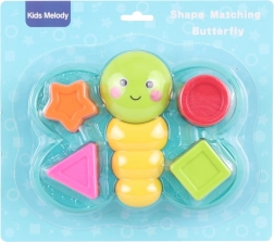Kleurige plastic insteekpuzzel in de vorm van een vlinder voor kleine ontdekkers vanaf 18 maanden. Stimuleert fijne motoriek, oog-handcoördinatie en herkenning van vormen en kleuren. Bevat 4 insteekblokjes en heeft compacte afmetingen, ideaal voor thuis en onderweg.