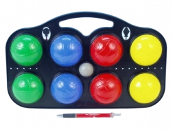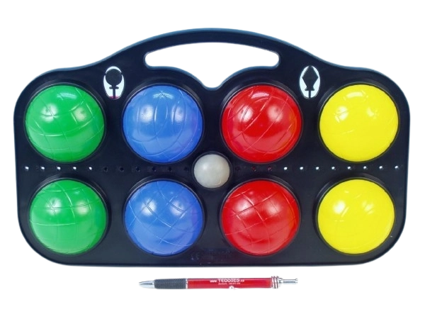 Set van acht plastic boules voor petanque, die ideaal zijn voor leuke buitenactiviteiten. Elke bal heeft een unieke kleur voor gemakkelijke identificatie tijdens het spel. Deze set wordt geleverd in een praktische verpakking die zowel opslag als vervoer van de speelballen vergemakkelijkt.