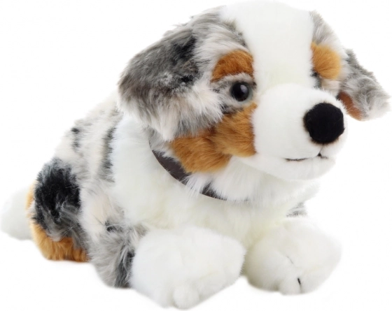 Een schattige pluchen hond van het ras Australische herder in liggende houding die zowel kinderen als dierenliefhebbers zal bekoren. Hij is zacht, fluweelachtig en dankzij het eco‑friendly ontwerp vriendelijk voor de natuur. Ideaal om mee te knuffelen, om mee te spelen of als decoratie in de kinderkamer.