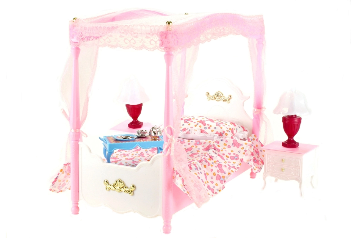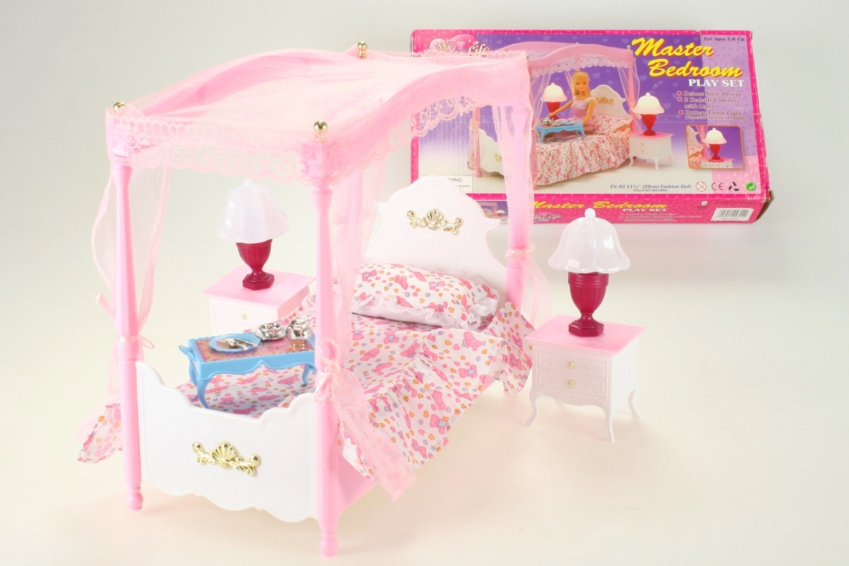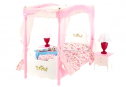Verwen poppen met een luxe nachtrust met het elegante GLORIE hemelbed. De set bevat een bed met sprei en kussentje, twee nachtkastjes en twee lampjes die gaan branden wanneer je de cilinder draait. Ideaal voor creatief spel en stijlvolle poppenhuizen.