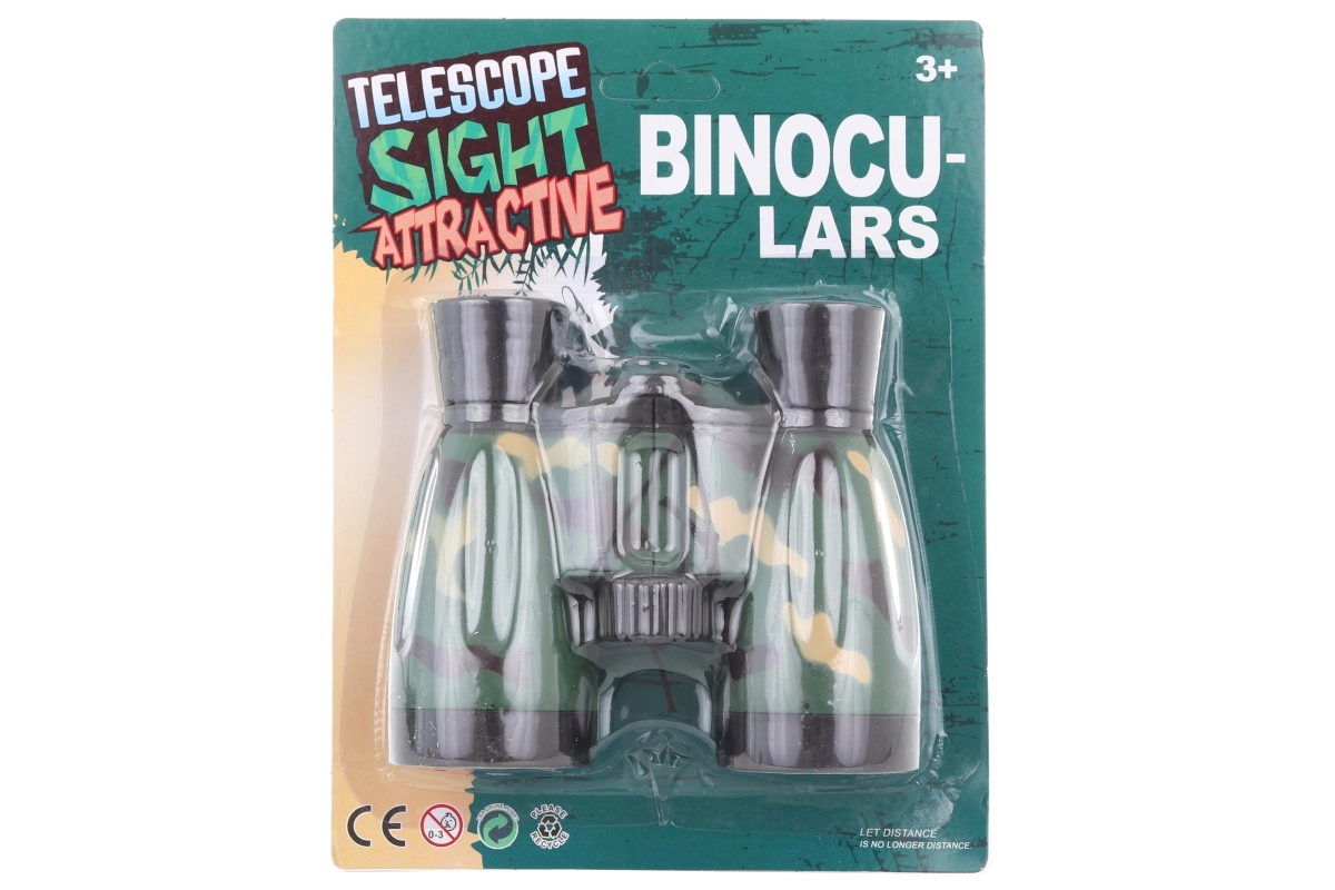Kunststof camouflageverrekijker van ca. 13,5 x 12 x 5 cm. Afmetingen van de verpakking ca. 17 x 22 x 5,5 cm. Leeftijd 3+