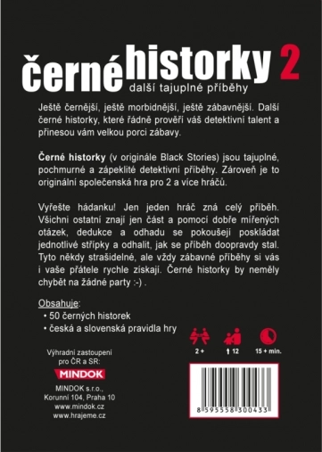 Nog zwarter, nog spannender en zeker nog leuker! Zwarte Verhalen 2 brengt een nieuwe set raadsels die elke party losmaken. Eén speler kent het hele verhaal, de anderen proberen met slim gerichte vragen te achterhalen wat er echt is gebeurd.
