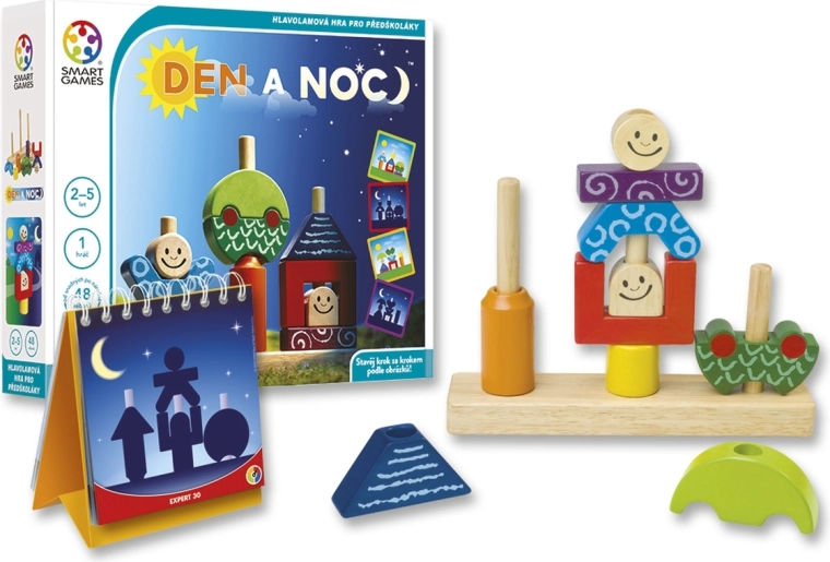 Dag en nacht is een slim ontworpen logisch spel voor één speler, dat kinderen meeneemt van de eerste eenvoudige bouwvoorbeelden tot meer veeleisende ruimtelijke taken. Op de dagkaarten zijn alle details zichtbaar, terwijl de nachtkaarten alleen silhouetten tonen – zo traint het kind verbeeldingskracht, aandacht en fijne motoriek.