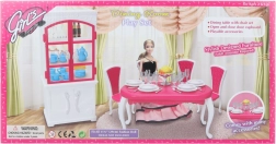 De Glorie eetset voor poppen biedt een complete eetervaring met een elegante plastic tafel, vier stoelen en een kastje, aangevuld met borden, glaasjes, bestek en decoratieve accessoires.