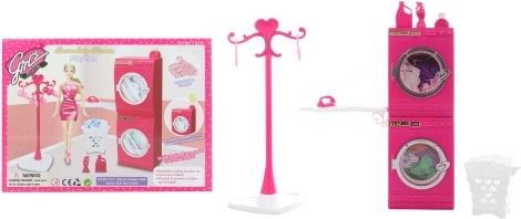 Geef kinderen een realistische speelervaring met de complete set Glorie wasserij. De set bevat een wasmachine die draait na het indrukken van de knop, een droger, een strijkplank, een kapstok, een wasmand en kledinghangers. Ideale aanvulling voor poppenhuizen vanaf 3 jaar.