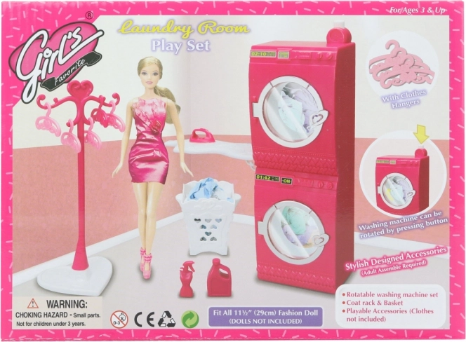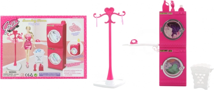 Glorie wasserij voor poppen: wasmachine met draaifunctie, droger, strijkplank, kapstok en accessoires. Geweldig rollenspel voor kinderen vanaf 3 jaar.