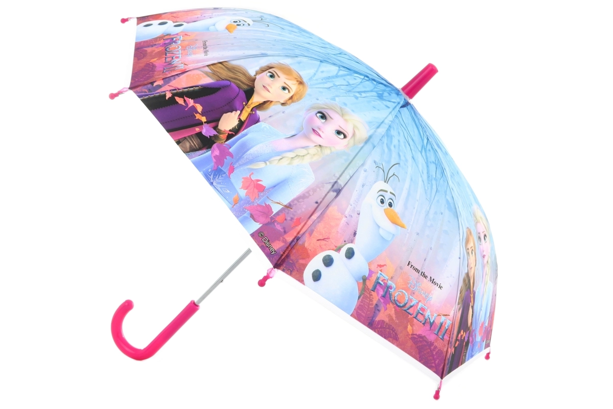 Handmatige paraplu met Frozen-motieven. Afmetingen van de uitgeklapte paraplu ca. 64 x 64 x 60 cm. Afmetingen van de verpakking ca. 60 x 8,5 x 4 cm. Verpakt in een plastic zak.