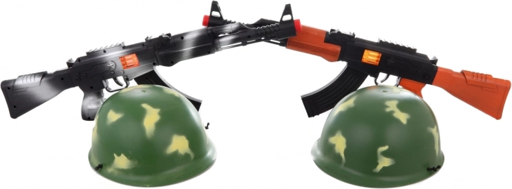Een leuke kinderset voor kleine soldaten met een ratelend plastic machinegeweer van circa 53 cm en een militaire helm met een binnendiameter van circa 18,5 cm. Een geweldige keuze voor soldaatje spelen, het stimuleren van de fantasie en actieve avonturen. Geschikt voor kinderen vanaf 3 jaar.