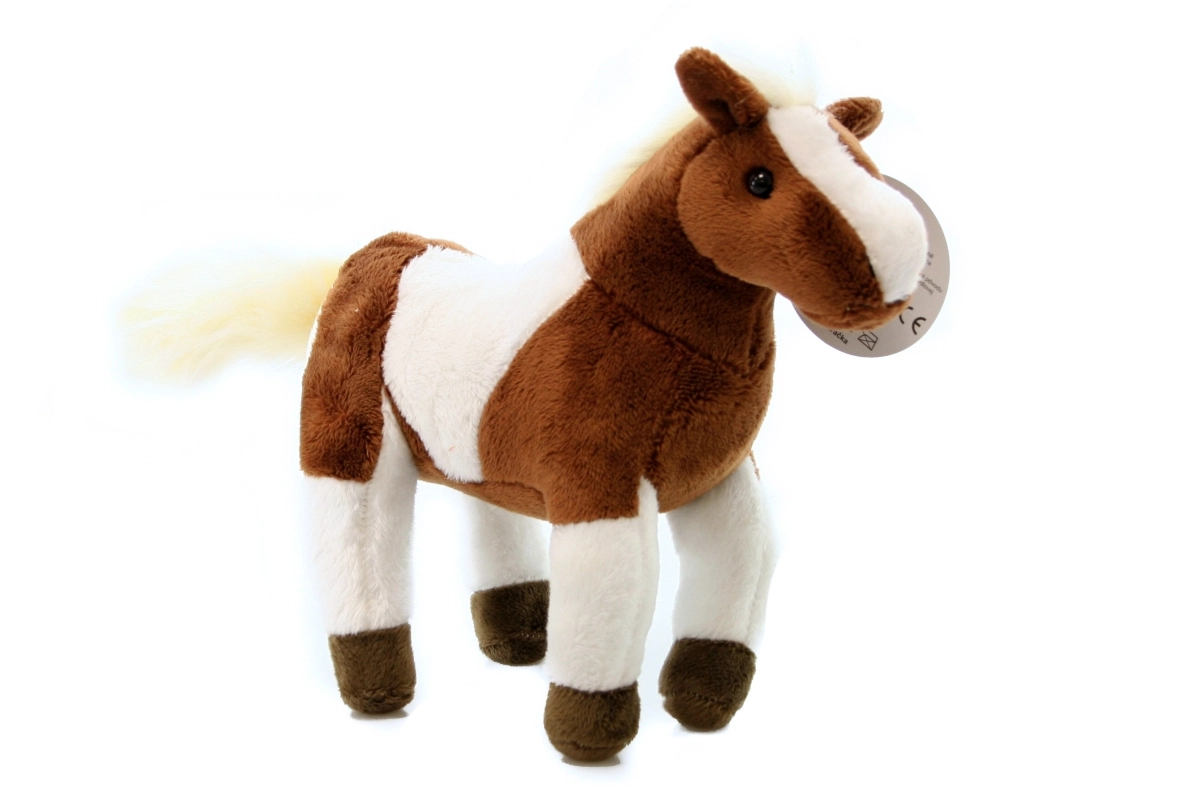 Schattig bruin-wit pluchen paard met gevlekt patroon en witte manen, voor kleine én grote dierenliefhebbers. Het is heerlijk zacht, staand uitgevoerd en geschikt vanaf de geboorte. Ideaal om mee te spelen en te knuffelen, een geweldig cadeau voor de kinderkamer. Zachte pluche, staande uitvoering, veilig vanaf 0+, compact formaat 23 cm.