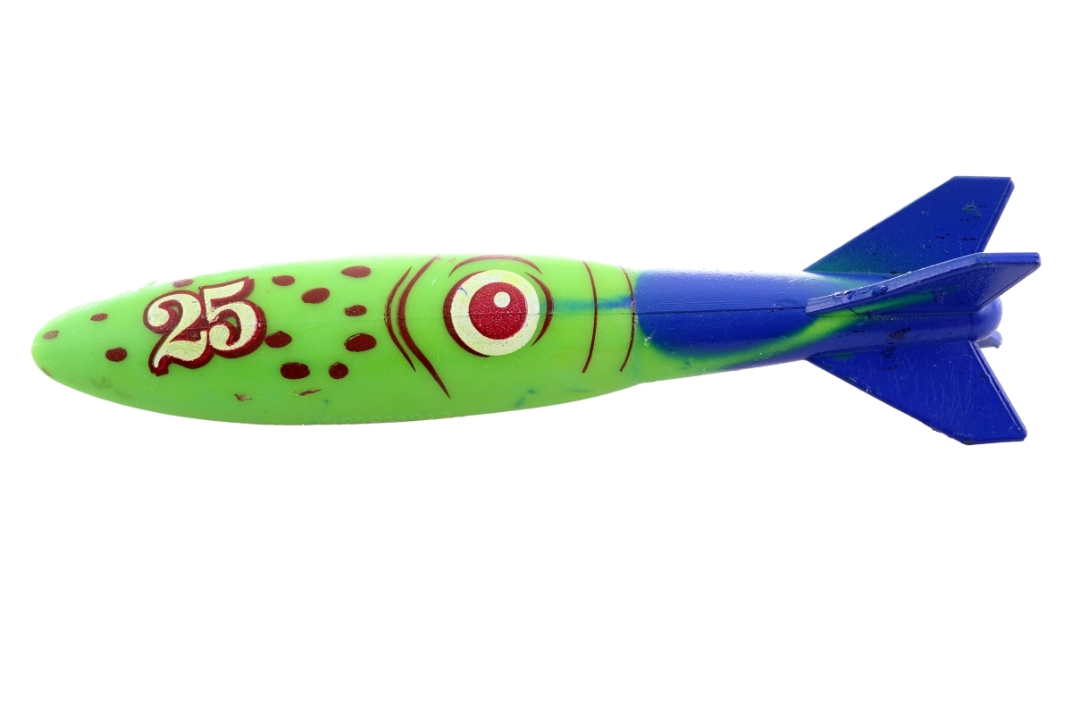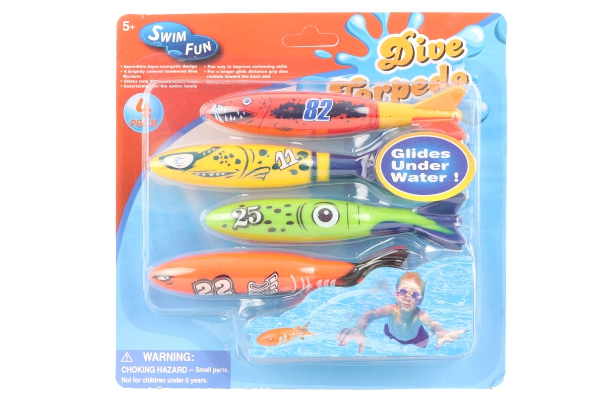 Leuke en veilige onderwater duikraketten van 12,5 × 3 cm in een praktische set van 4 stuks. Perfect voor het opvrolijken van zwem- en duiktraining, het oefenen van oriëntatie onder water en spelletjes in het thuiszwembad (onder toezicht van een volwassene). Geschikt voor kinderen vanaf 5 jaar.