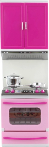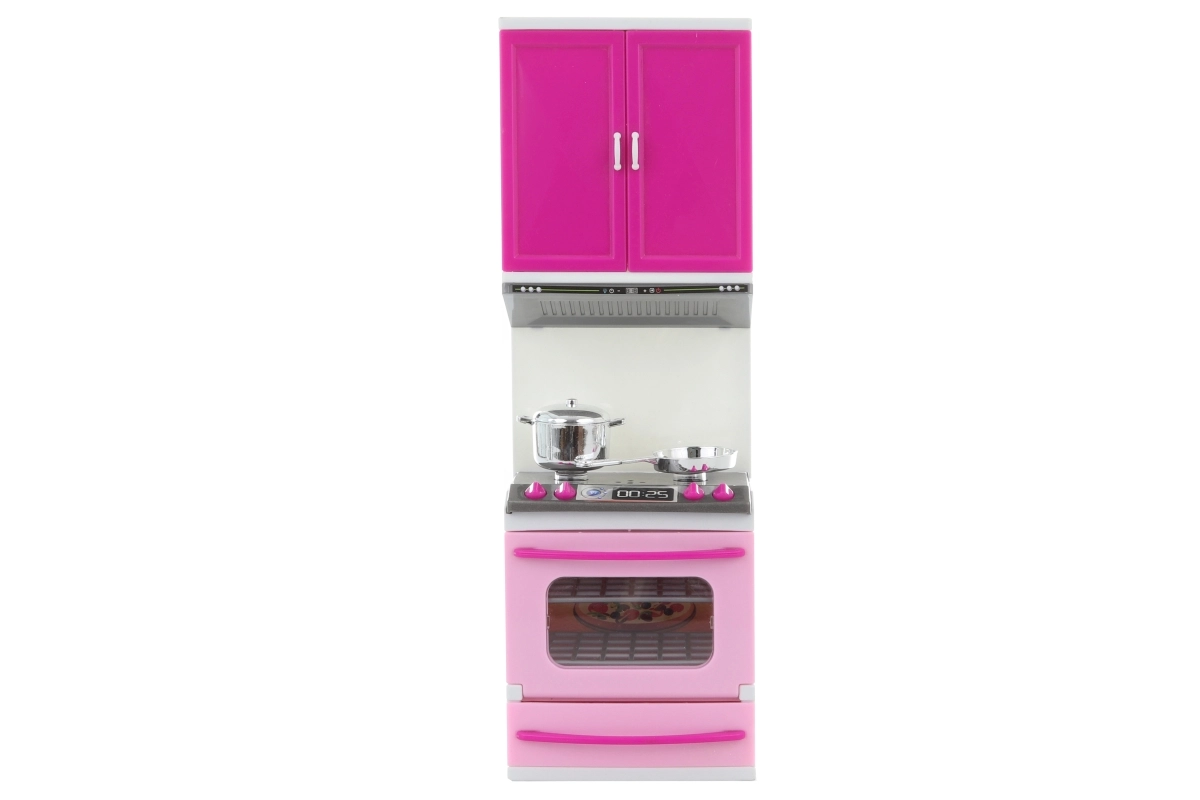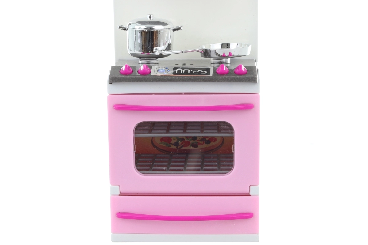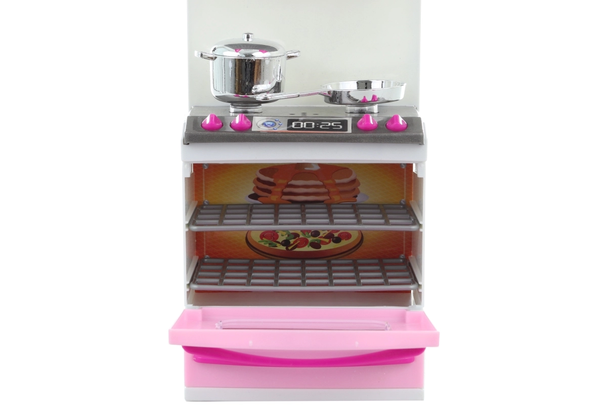 Dit keukenblok verrast met lichteffecten op de kookplaten en in de oven, die het spel een realistisch karakter geven. De ovendeur kan gemakkelijk worden geopend voor toegang tot denkbeeldige lekkernijen.