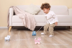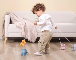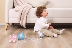 Dankzij de bewegende wielen en de mogelijkheid om te trekken ondersteunt het speelgoed de fysieke ontwikkeling en coördinatie.