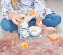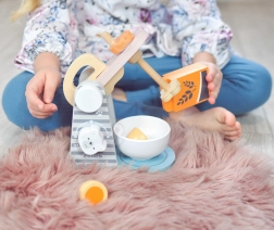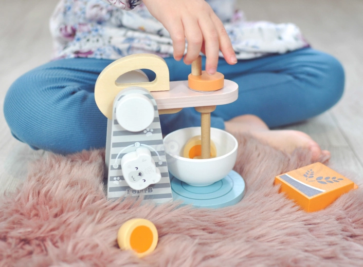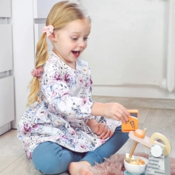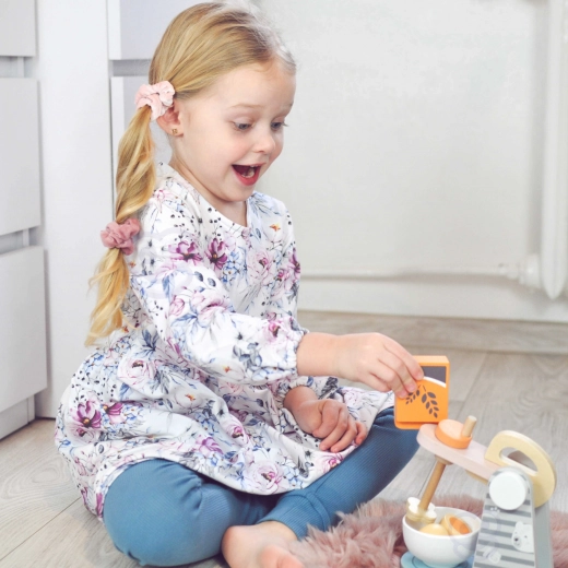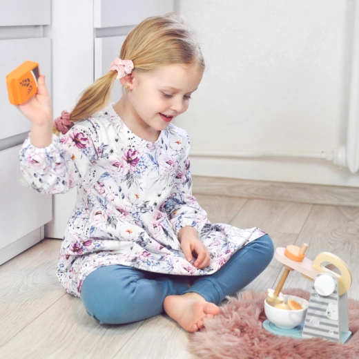Deze roze-grijze mixer met opklapbare arm en stijlvolle designelementen stelt kinderen in staat kookvaardigheden te simuleren in rollenspellen. De mixer heeft een praktische handgreep, zodat kinderen de kom gemakkelijk kunnen plaatsen of verwijderen, wat hun motorische vaardigheden stimuleert.