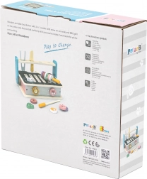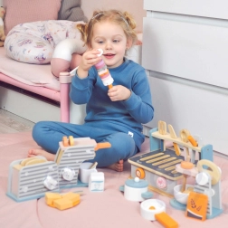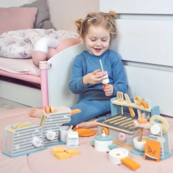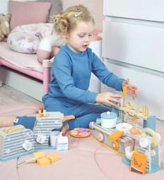 Alles wat je nodig hebt voor de eerste receptjes is inbegrepen: twee pannen en basisgerei (mes, lepel, spatel, tang), spiesen voor spiesjes en houten etenswaren zoals vlees, eieren en groenten. De kleurrijke uitvoering nodigt uit tot spelen en ondersteunt de rol van de kleine kok.