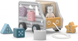 Houten trek- en inbouwspeelgoed in de vorm van een vrachtwagen. Afmetingen ca. 18 x 12 x 6,5 cm. Afmetingen verpakking ca. 19 x 16,5 x 13,5 cm. Leeftijd 18m+