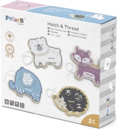 De PolarB Match & Thread-set brengt kinderen plezier in creëren en leren. Gekleurde houten dierkaarten hebben gladde randen en voldoende grote gaten voor gemakkelijk rijgen. Kinderen oefenen greep, precisie en logisch denken terwijl ze de afzonderlijke delen samenstellen en het veteren trainen.