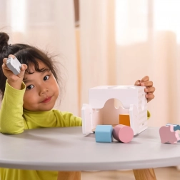 Houten inlegpuzzel met dieren. De blokjes rammelen. Afmetingen van de inlegpuzzel ca. 13,5 x 12 x 14,4 cm. Afmetingen van de verpakking ca. 15 x 14,5 x 13 cm. Leeftijd 18m+