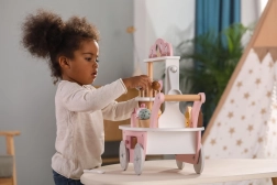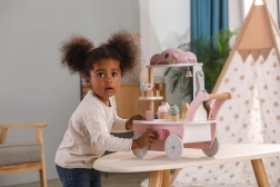 De houten 3-in-1 kraam POLARB van VIGA verandert elke kamer in een zoet koninkrijk. Dankzij het verrijdbare ontwerp, het belletje en de kleurrijke set houten lekkernijen oefenen kinderen creativiteit, communicatie en rollenspel als verkoper of patissier. De zachte pastelkleuren en zorgvuldige afwerking nodigen uit om keer op keer te spelen.