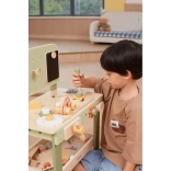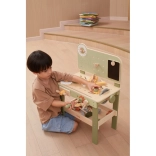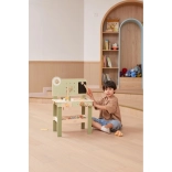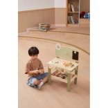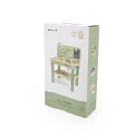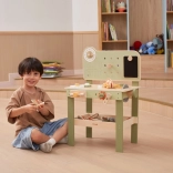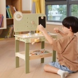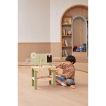 De stijlvolle kinderwerkbank in een natuur-groene uitvoering biedt een realistische werkplaatsbeleving in een veilige, houten vorm. Kinderen kunnen schroeven, wieltjes van het autootje verwisselen, de onderdelen “zagen”, tandwielen in elkaar zetten en de principes van oorzaak en gevolg ontdekken. Dankzij de overzichtelijke opbergruimte zijn alle onderdelen en het gereedschap altijd binnen handbereik.